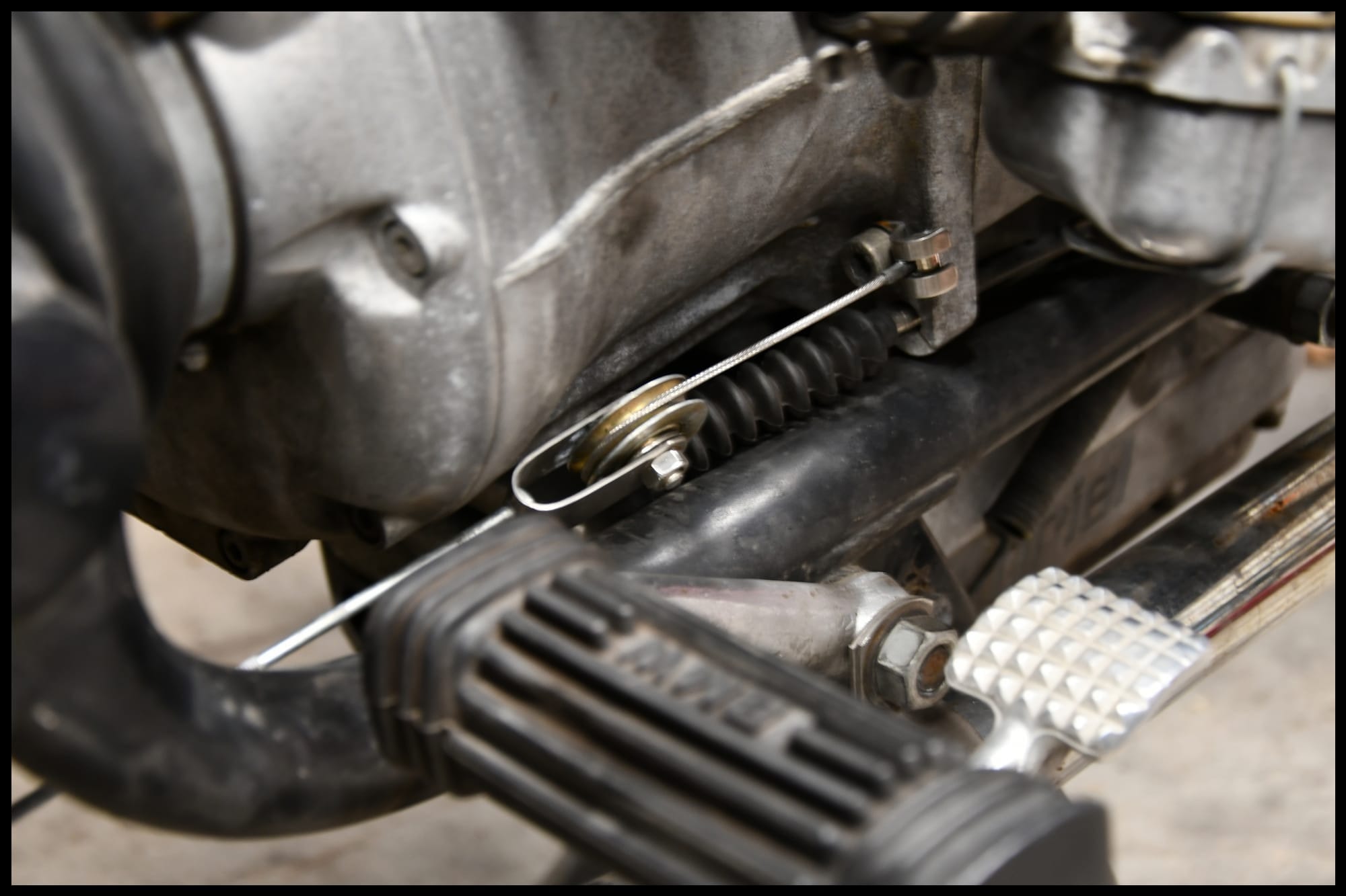 Plucked from a bin full of parts in various stages of usefulness, Tom emerged with a clutch assist system I didn’t know existed. Lying dormant for a few years, it was time to earn its keep and stop loafing around. Designed by Twin Headlight Ernie, the pulley reduces the force needed for the clutch lever to engage, making it easier to pull in. Over a few secretive lunch breaks, the installation was complete, and I was presented with a confident assurance that I could ride again. Testing the results with a rip around the block, I extended the neighbourhood route and haven’t looked back.